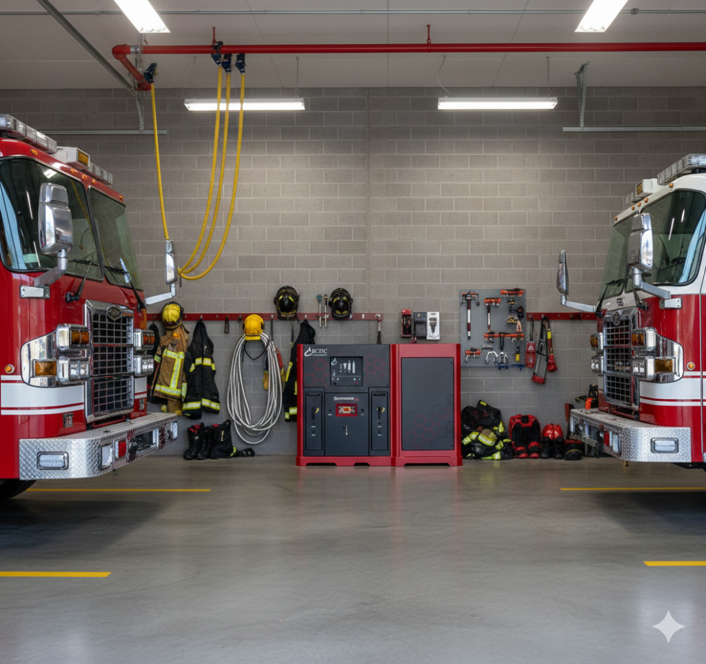 The new Superior 7K All-In-One, fully integrated with a 24 CFM air compressor, four fill positions standard, and 7000 PSI air storage. It’s everything firefighters need to efficiently fill a team’s SCBAs in one simple American-made breathing air package.
